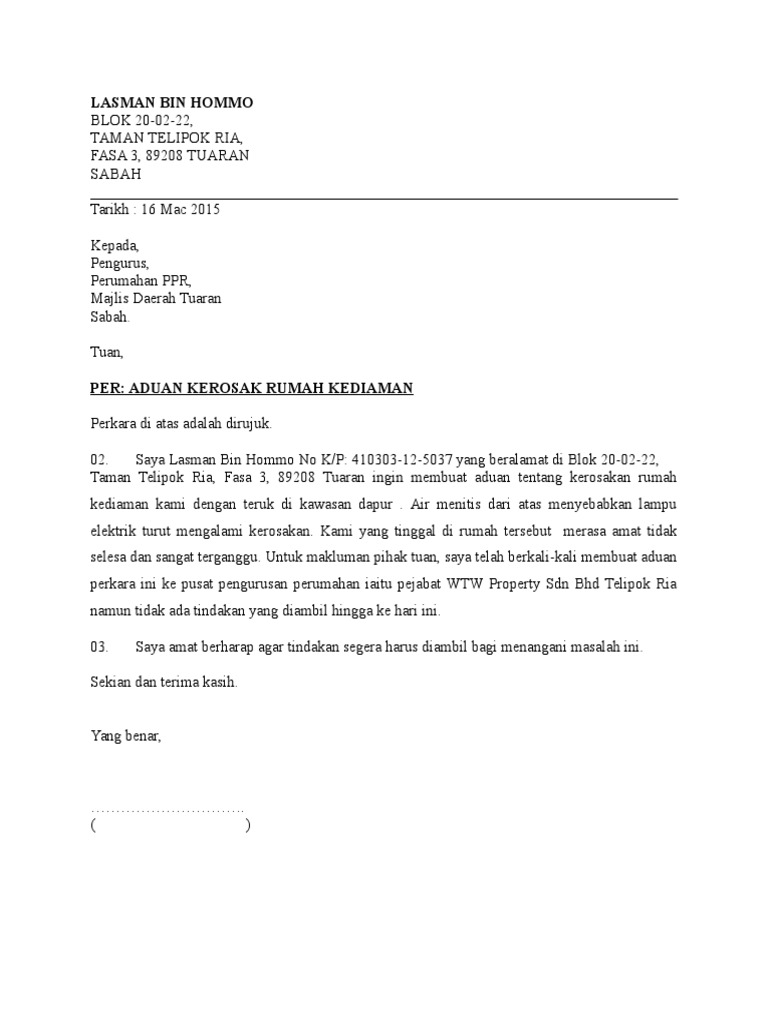 Surat Aduan Kepada Perumahan from imgv2-2-f.scribdassets.com Maka ia akan akan mengajukan permohonan kepada pihak tertentu untuk memberikan bantuan, dana, kerjasama atau mungkin rekomendasi. Bila dah dapat kunci, periksa dulu kalau kalau ada sebarang kerosakan dekat rumah baru korang tu. Bersama surat ini disampaikan dengan sangat hormat kepada saudara botanica putri bahwasanya berdasarkan evaluasi dan penilaian produktivitas kerja, perusahaan memutuskan mengangkat saudara menjadi karyawan tetap di pt. Contoh surat klaim kerusakan barang. Pemilik toko elektronik karya jln. Sore rekan2 netter.biasanya saya hanya memposting ulang/menshare ulang postingan dari teman di facebook, portal berita, yahoo, dan tulisan/postingan orang lain. Contoh surat rasmi aduan kerosakan rumah. Walaupun kami bukanlah pakar rujukan tepat,tetapi.