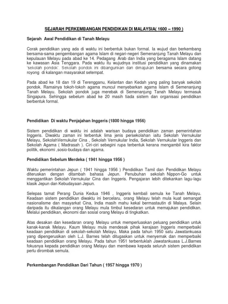 Sejarah awal pendidikan di tanah melayu corak pendidikan yang ada di waktu ini berbentuk bukan formal. Berdasarkan laporan jawatankuasa kabinet yang mengkaji perlaksanaan dasar pelajaran kebangsaan (1979), rancangan kurikulum baru sekolah rendah. So please help us by uploading 1 new document or like us to download Sistem pendidikan di zaman penjajahan inggeris di tanah melayu telah memberi kesan dalam mewujudkan polarisasi kaum di tanah melayu. Perkembangan sistem pendidikan di malaysia.