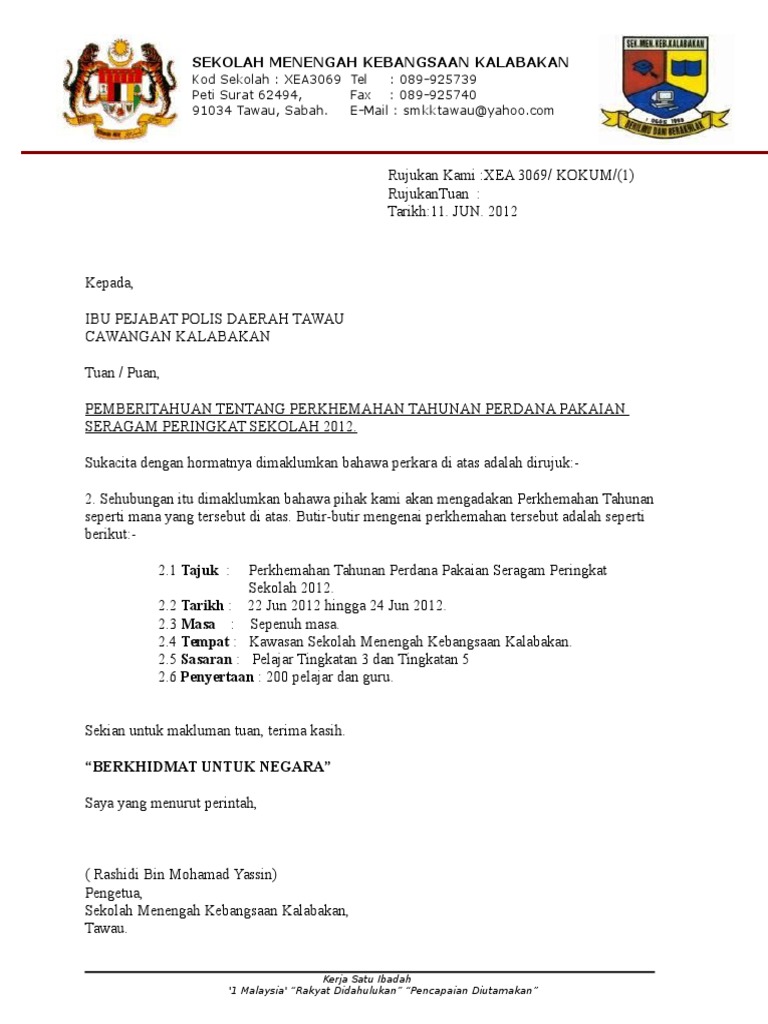 Surat surat pkhemahan buniform 2017 doc. Surat makluman dan sop pendaftaran semula pelajar akan diberikan melalui email pelajar. Documents similar to surat makluman kepada polis. Use the download button below or simple online reader. The file extension pdf and ranks to the documents category. Jika ingin membuat pembayaran anda boleh teruskan kepada pembayaran online. Contoh surat kepada balai polis terdekat untuk langkah keselamatan sepanjang program berlangsung. Penawaran program tertakluk kepada jumlah minimum calon yang layak. Mesyuarat promosi program pensiswazahan guru kertas makluman program pensiswazahan latar belakang • 5. Jika program noss di pb lama tidak sama dengan program noss di pb baru; Penghantaran melalui link ini hanyalah kepada pelajar yg masih belum menghantar borang jawapan syarikat ke upli psmza dan masih belum mengambil buku jurnal refleksi. Use the download button below or simple online reader. Contoh surat kepada balai polis terdekat untuk langkah keselamatan sepanjang program berlangsung.